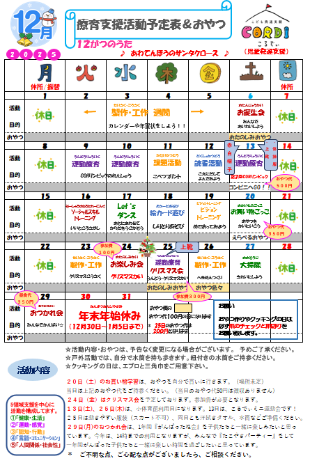 | 9:30 | 来所 ・検温、体調チェック ・朝の準備 ・朝のお集まり ・午前の活動(個別活動or集団活動) |